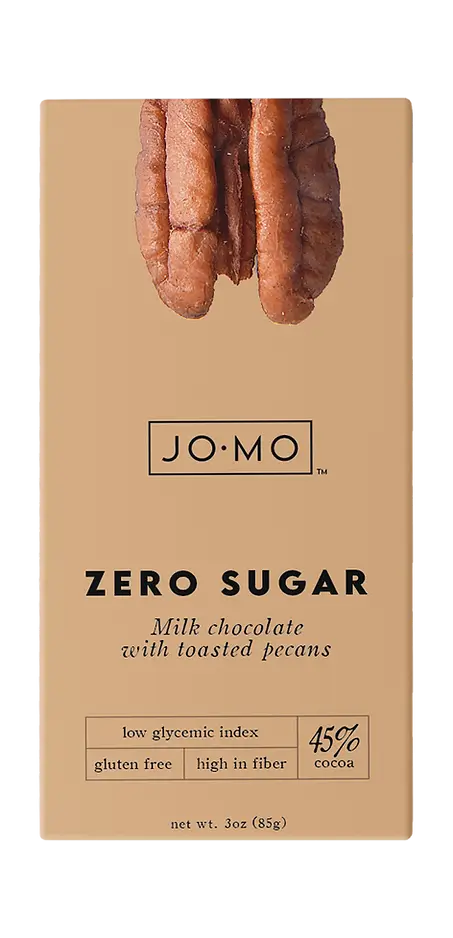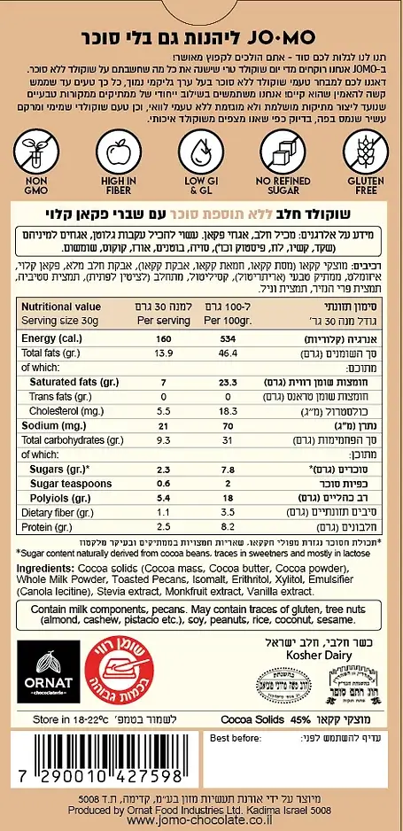 ג’ומו שוקולד חלב ללא תוספת סוכר עם שברי פקאן קלוי.