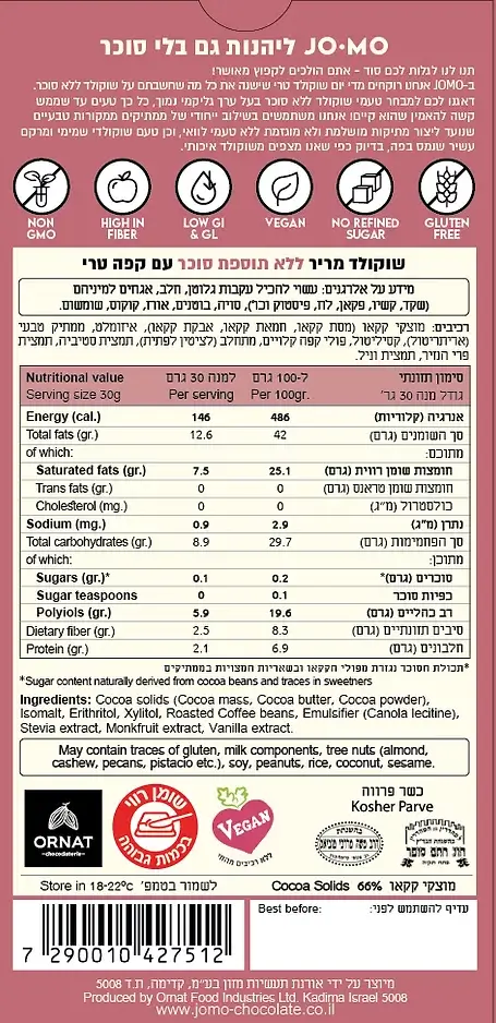 ג’ומו שוקולד מריר ללא תוספת סוכר עם קפה טרי.