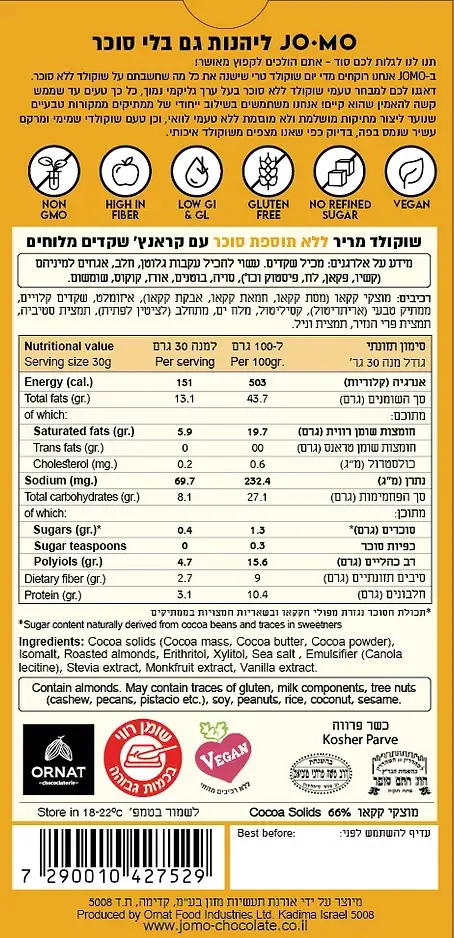 ג’ומו שוקולד מריר ללא תוספת סוכר עם קראנץ שקדים מלוחים
